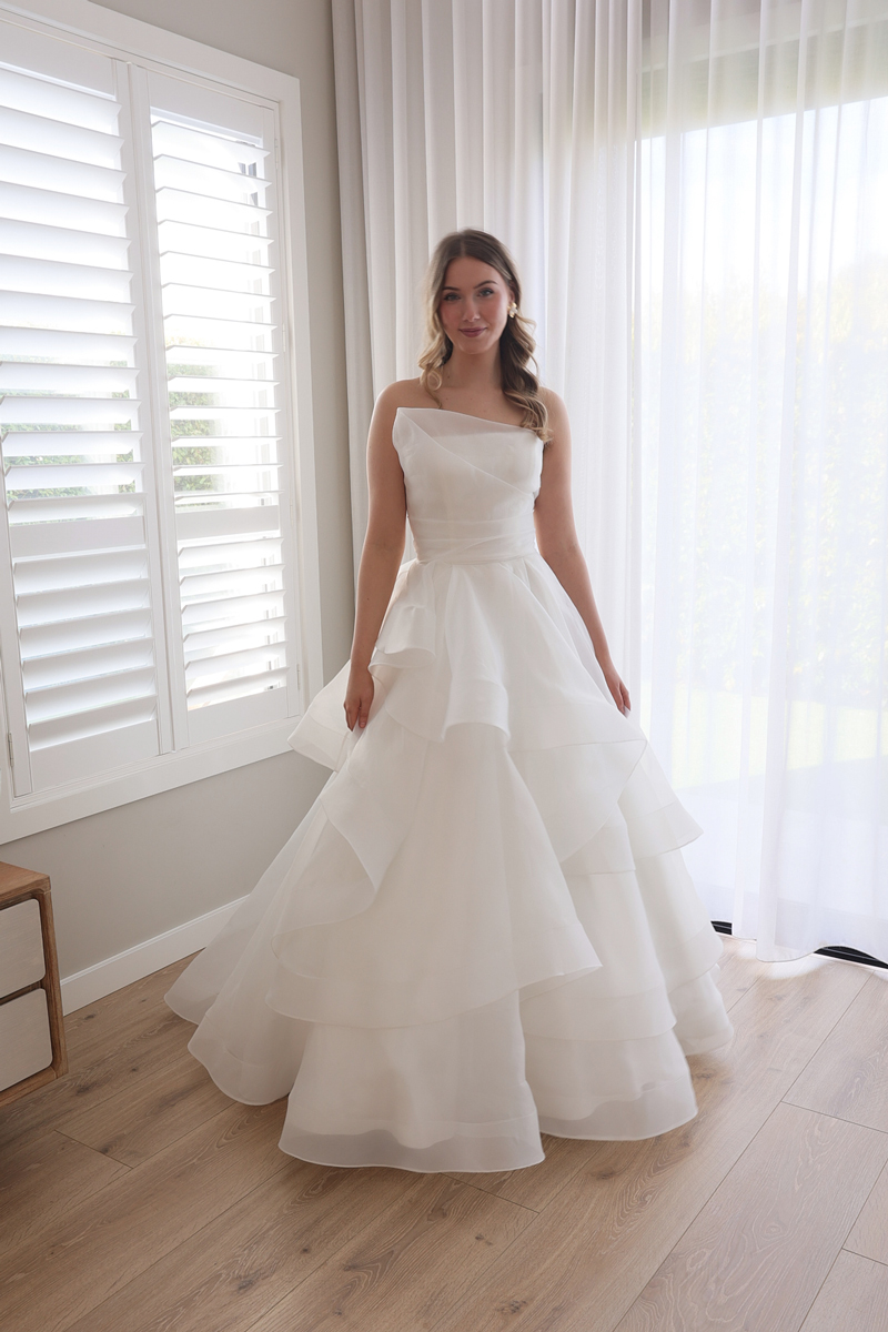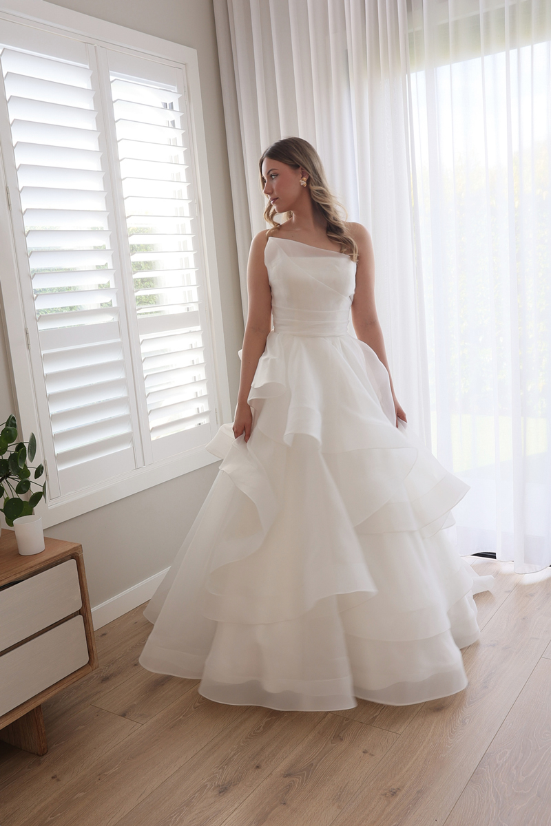 Crafted from soft organza, Addie features a striking asymmetrical neckline that brings a modern, fashion-forward edge to a romantic silhouette. Delicate gathering across the waist enhances the figure, drawing the eye inward before flowing into a full, cascading skirt. The standout waterfall ruffle skirt creates beautiful movement with every step, offering texture, drama, and an unforgettable presence down the aisle. A lace-up back adds a touch of timeless romance while allowing for the perfect, adjustable fit. Finished with a chapel-length train, Addy is available in both ivory and white, giving you the choice to suit your vision.