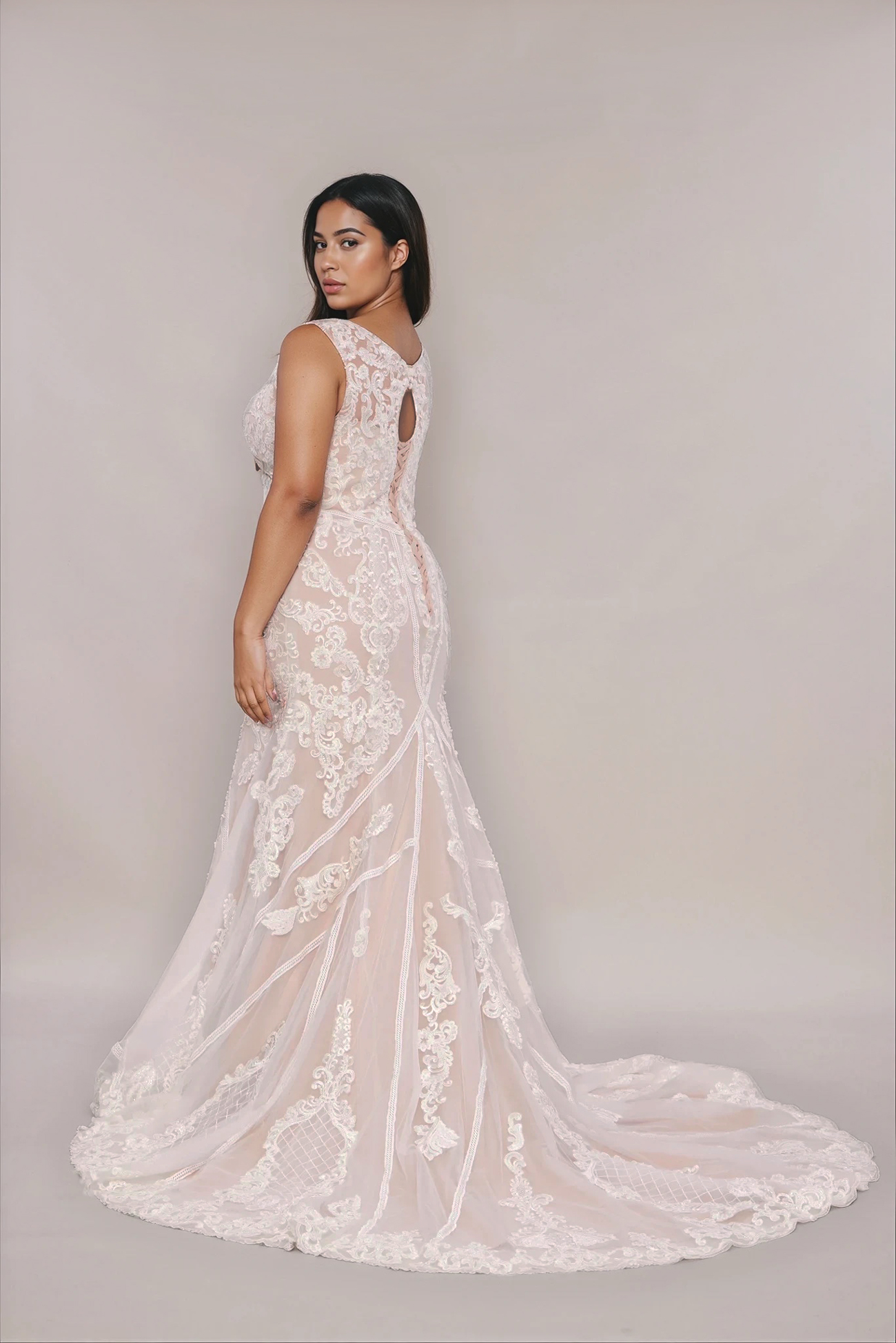 Featuring a striking lace overlay and delicate straps, it hugs the body in all the right places. The keyhole back adds a modern, alluring touch, making Alexia perfect for the bride who wants to make a statement while radiating timeless sophistication.