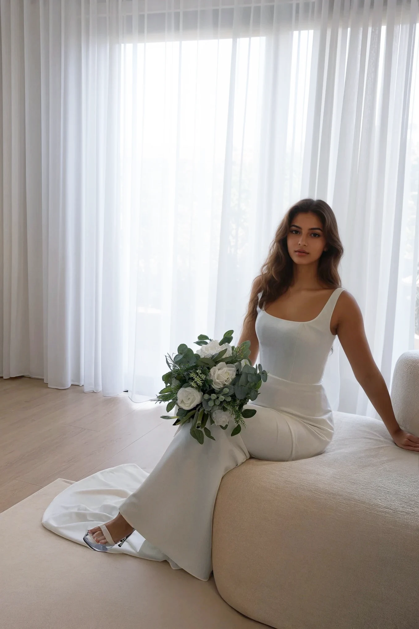 Effortlessly chic and designed for the modern bride, the Charlotte designed by Leah S Designs wedding dresses in Melbourne is a blend of elegance and simplicity. Crafted from luxurious crepe fabric, this gown skims your shape, creating a sleek and sophisticated silhouette. The structured square neckline adds a contemporary touch, while the fitted skirt gracefully flows into a soft train for an understated yet dramatic finish.