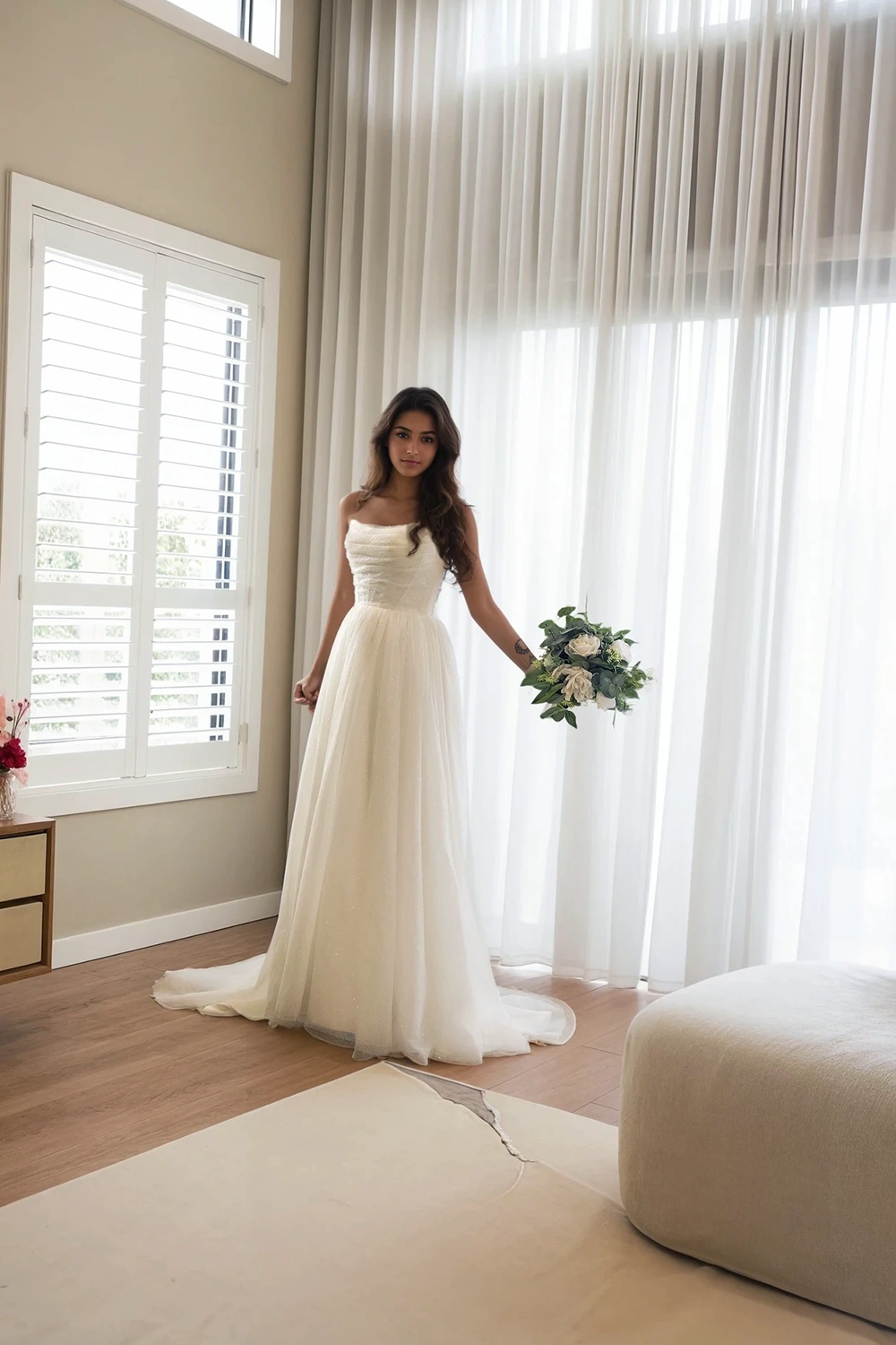 Step into your fairytale with the Colette organza bridal dress – a breathtaking blend of drama, structure, and sparkle. Crafted from layers of luxurious ivory glitter organza, this gown catches the light with every movement, making you the star of your own love story.