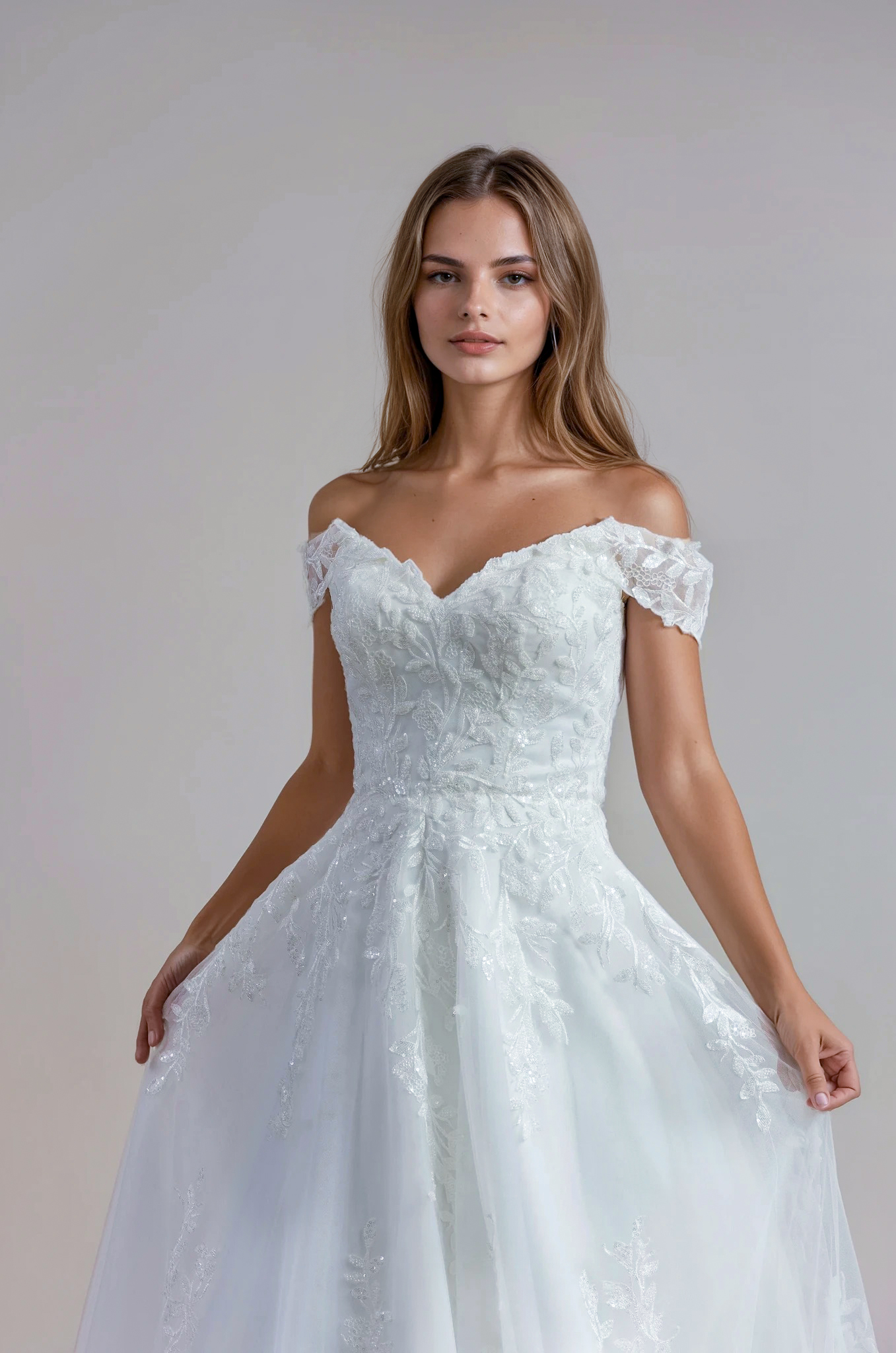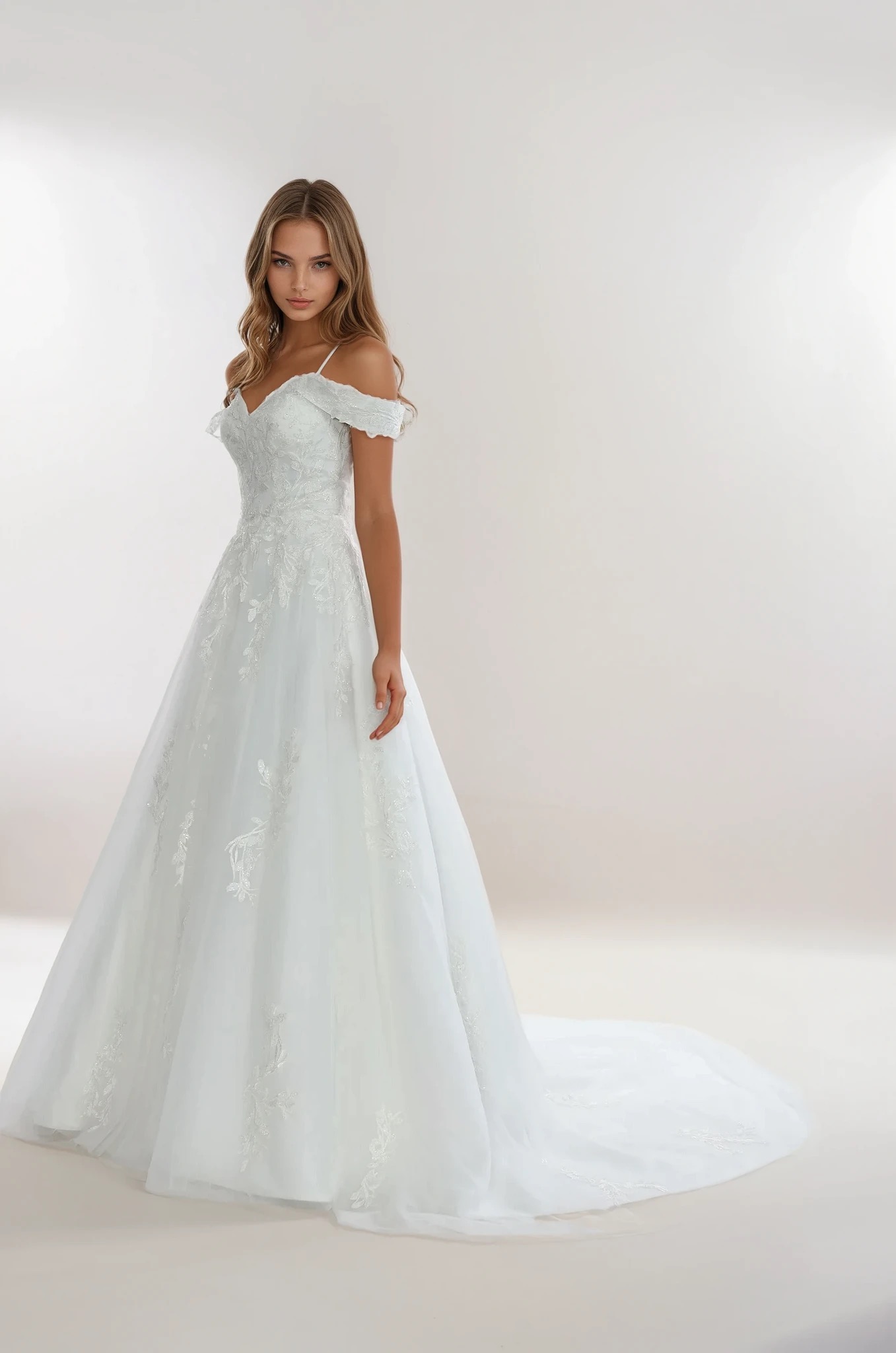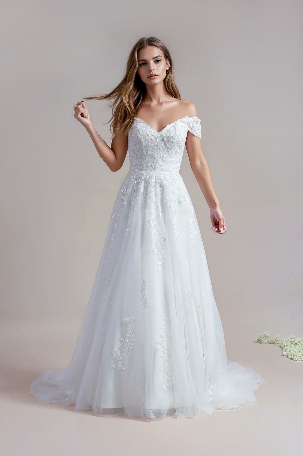 Dakota—is a wedding gown Australia design that’s all about making a statement! Whether you go for the off-the-shoulder look or a classic v-neckline, the beaded lace bodice on this dress is pure magic. With its full tulle skirt and a long, dramatic train that’s detailed with lace, this gown was made for brides who want to embrace a fairytale moment. And if you’re feeling extra bold, you can even opt for the dreamy, experimental periwinkle colour instead of traditional ivory.
