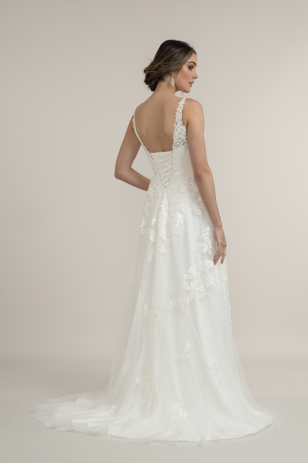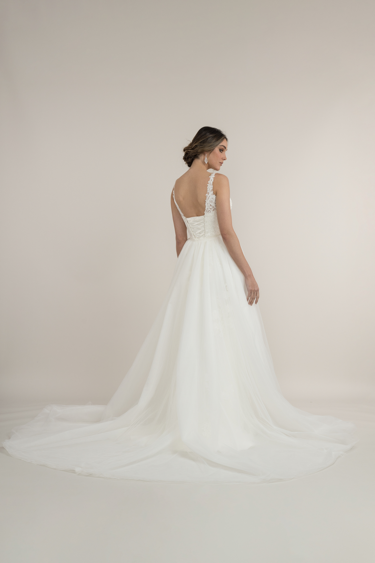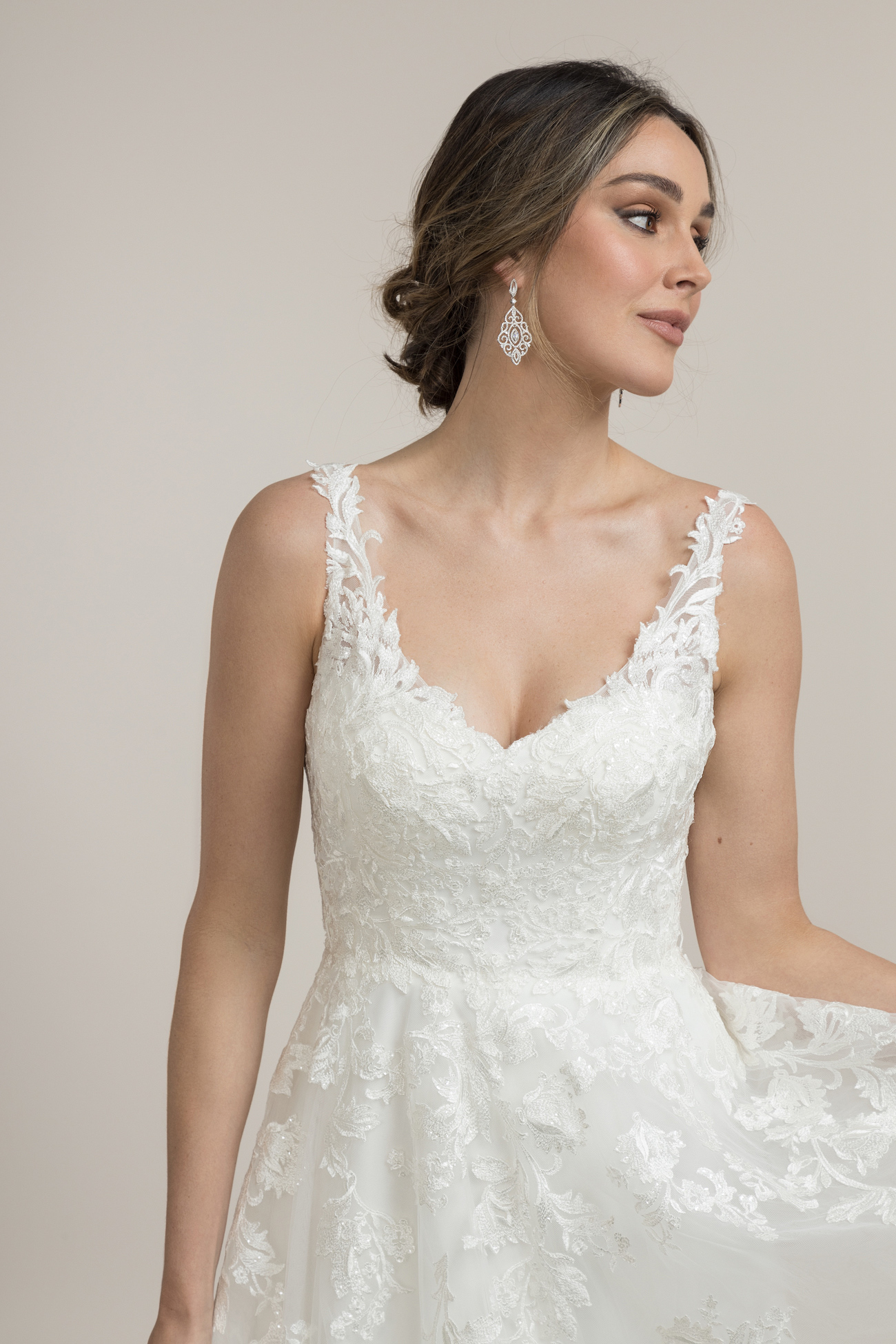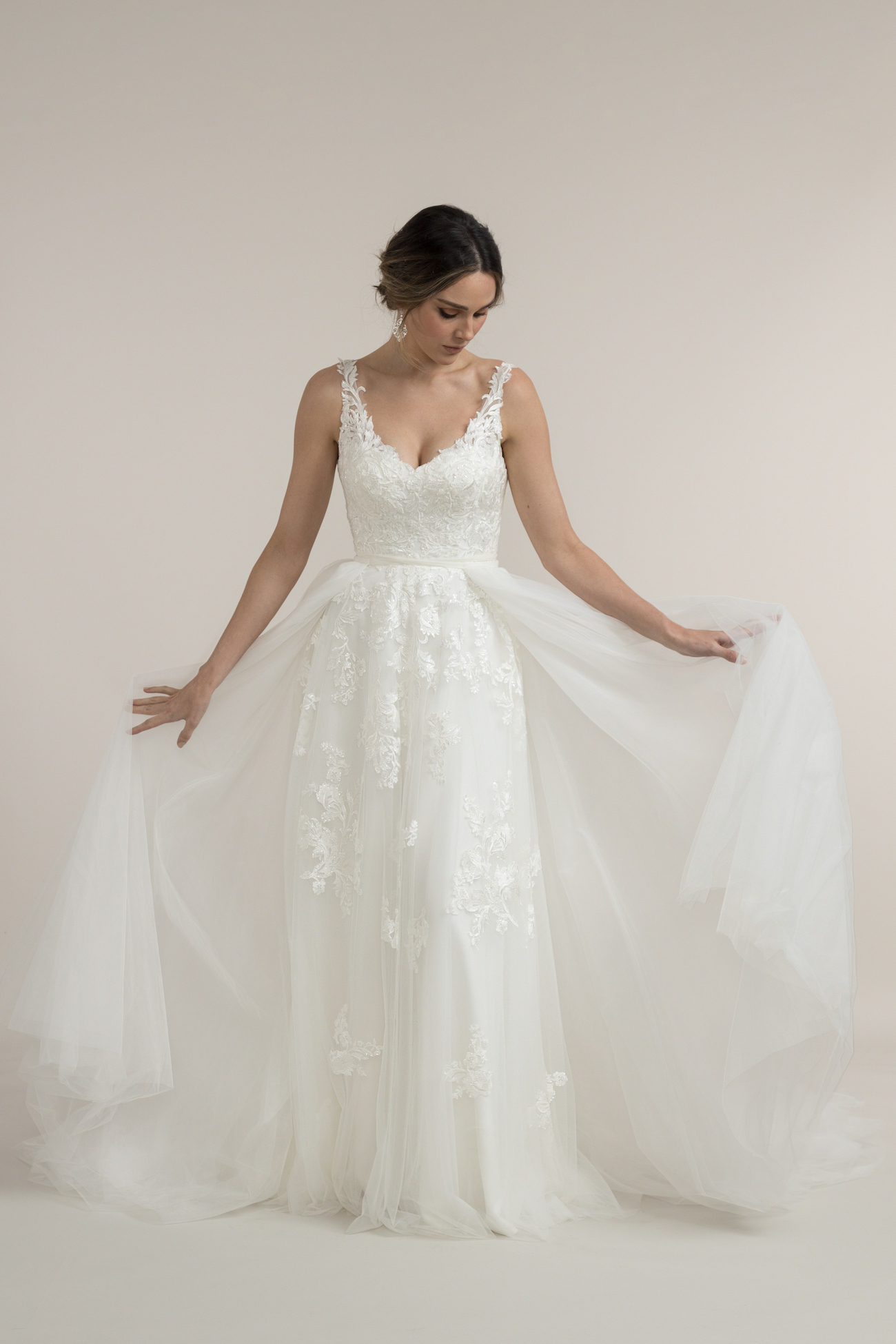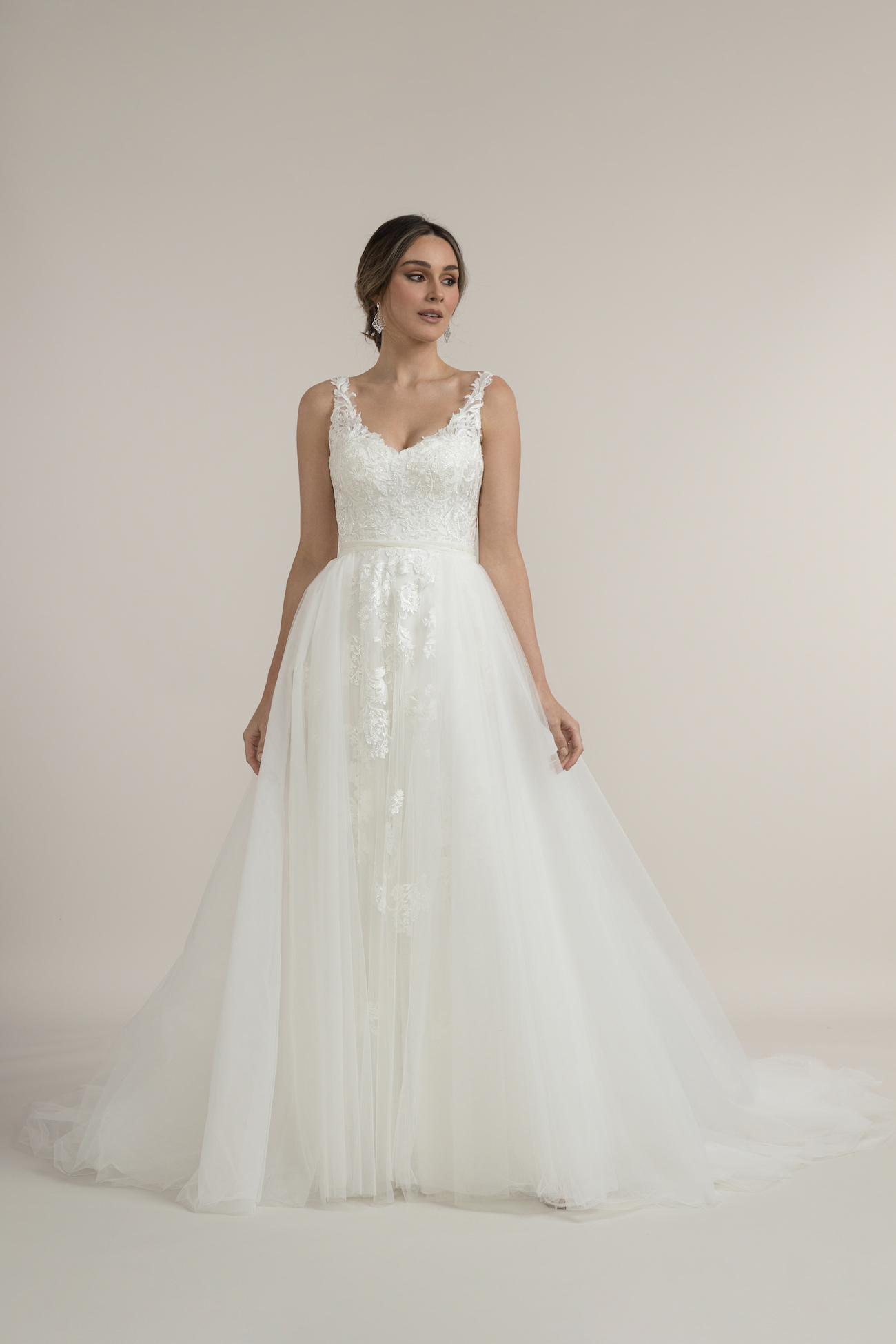 The soft tulle lace overlay skirt has cascading lace embellishments that capture light with your every move. Divine’s full-length skirt comes with a perfect length 15-inch train, so you will be a vision from every angle.