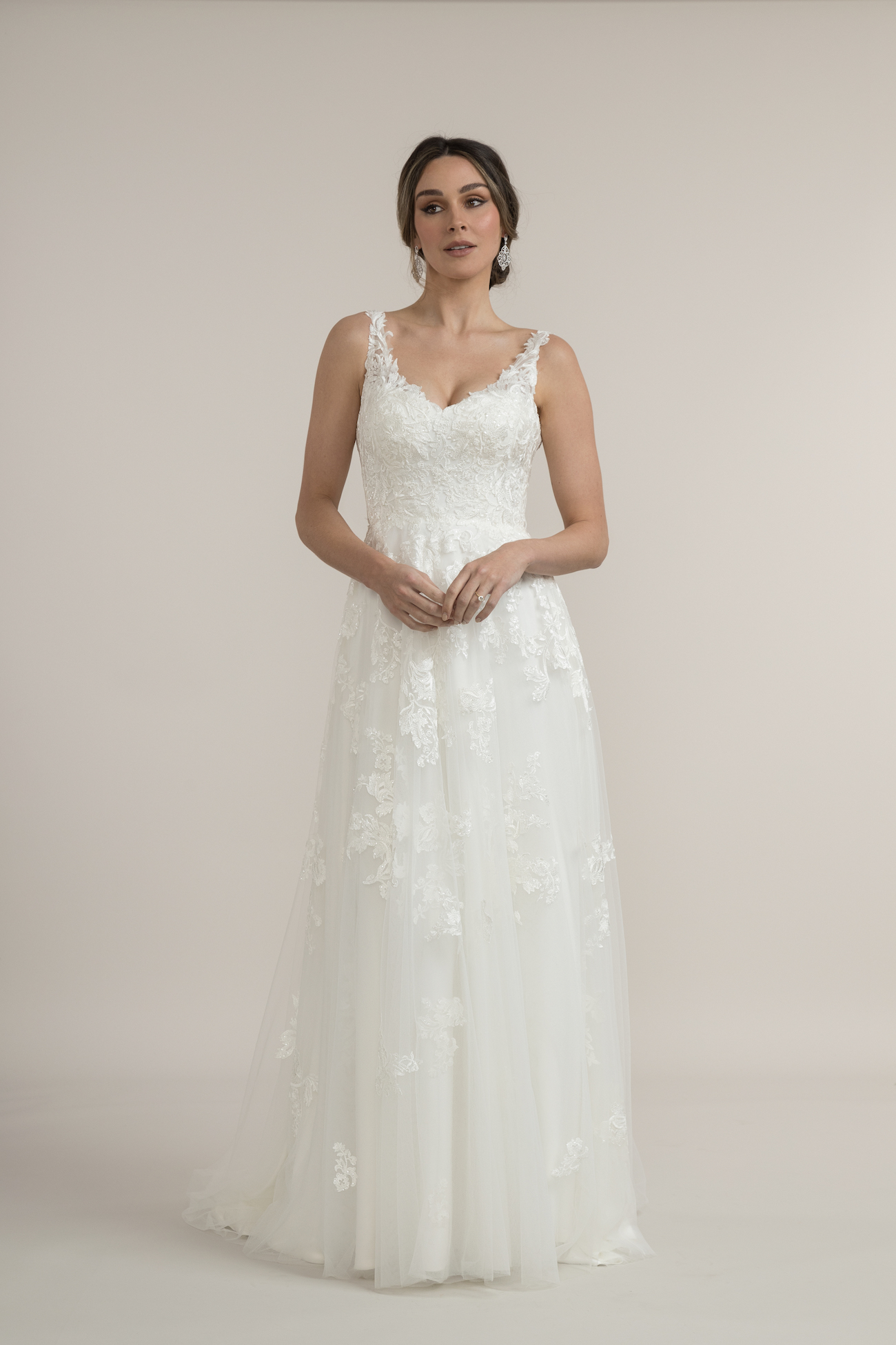 Perfectly suited for brides wanting to convey classic elegance in an irresistible, whimsical style. Feel like you are floating on air in this exquisite tulle gown. This gown has an enchanting quality that will captivate you as well as your guests. This popular enduring A-line design has an accentuated V-neckline. Featuring beloved Sweet Heart styling with continuous lace straps. Shown with an optional detachable Celine tulle overskirt $499. Colour: Ivory, Black and 35 other colours Fabric: Sequin lace over tulle