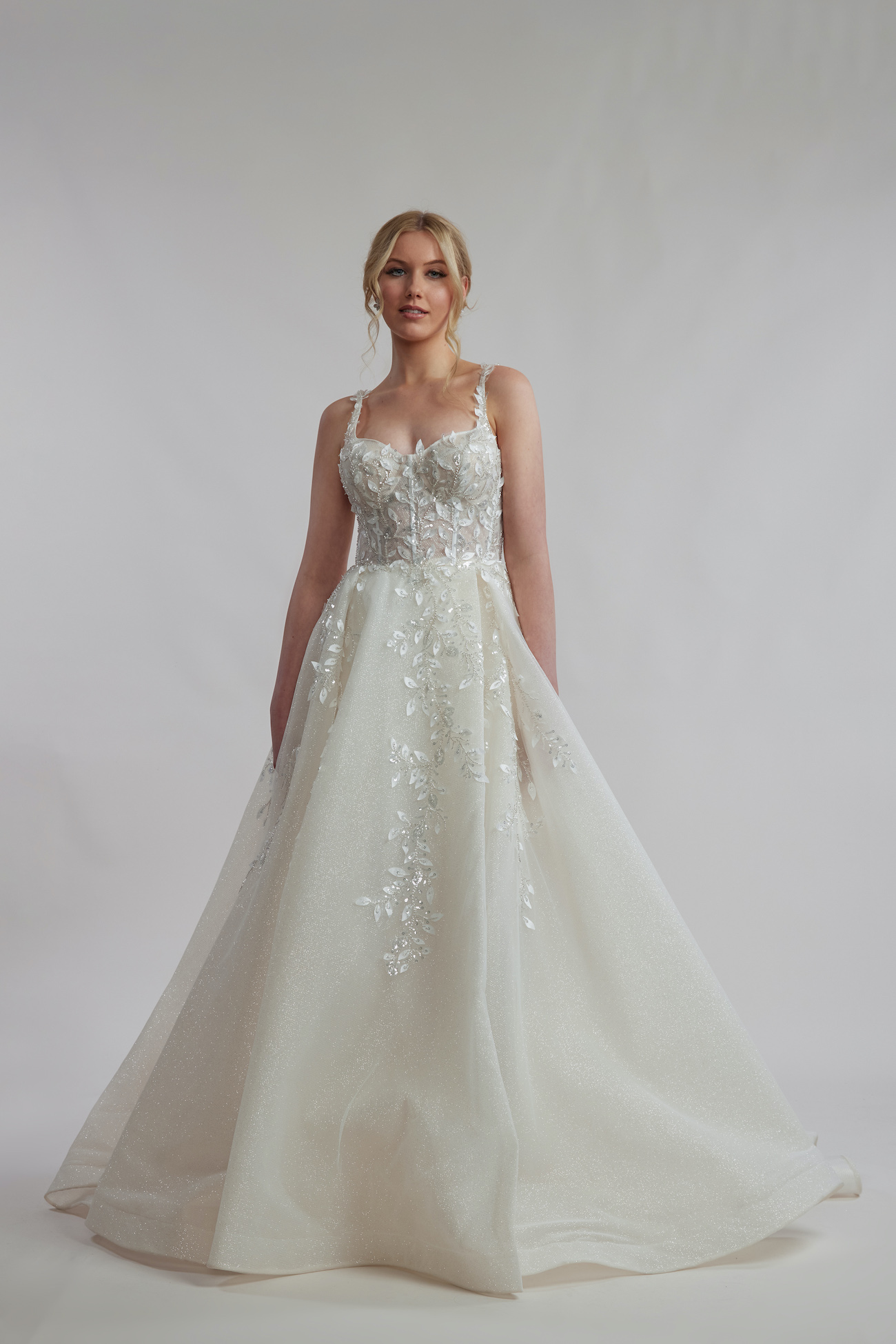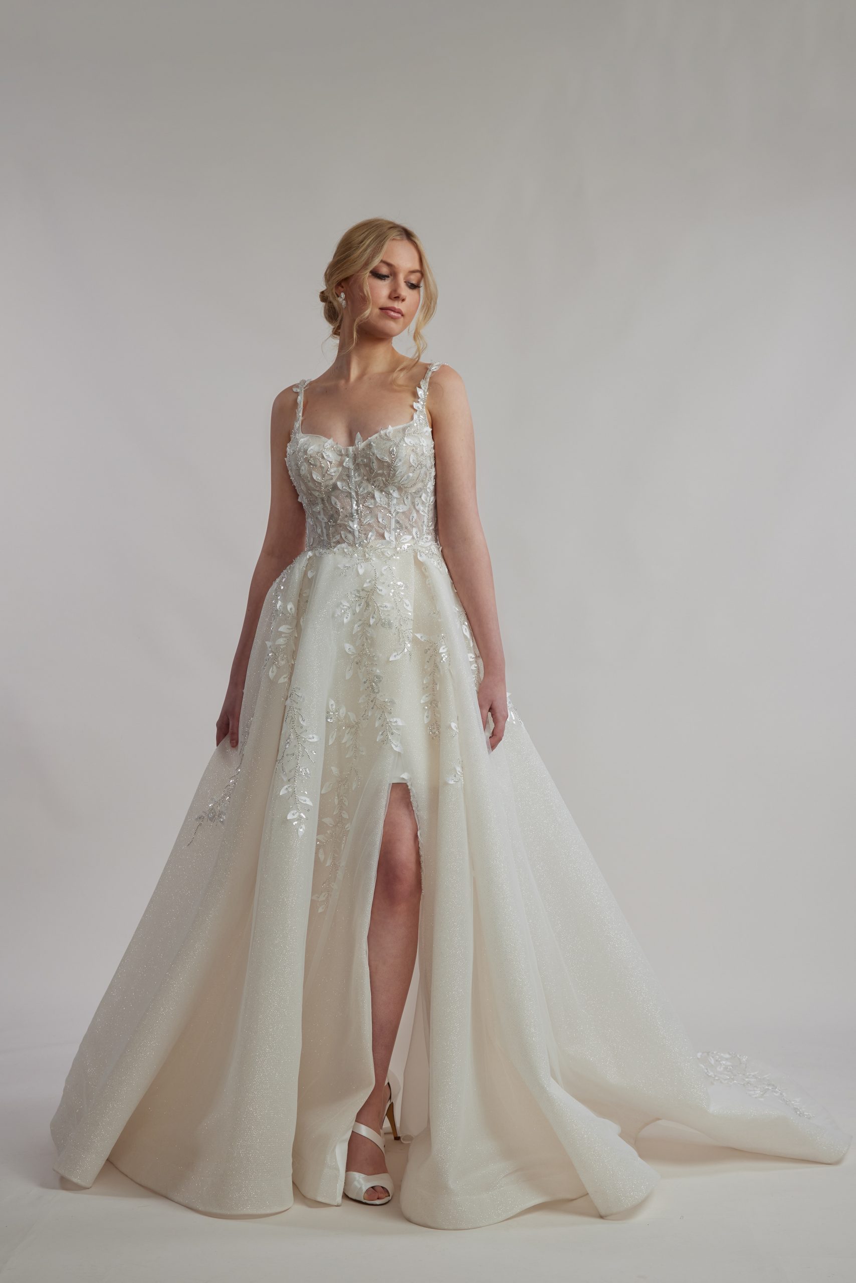 Introducing our dreamy “Hampton” luxury wedding dress, where elegance meets enchantment! Picture yourself in this opulant gown, made in a soft champagne hue that is timeless splendor. The corset bodice has a romantic sweetheart neckline and delicate lace shoulder straps, ensuring a perfect fit and just the right touch of sparkle. Below the waist, a full net skirt cascades gracefully, complete with a flirty side split that adds a modern twist. But here’s where the magic truly unfolds: shimmering silver beadwork dances atop intricate floral lace. This Lux detail adorns the bodice, skirt, and even trailing down the train.