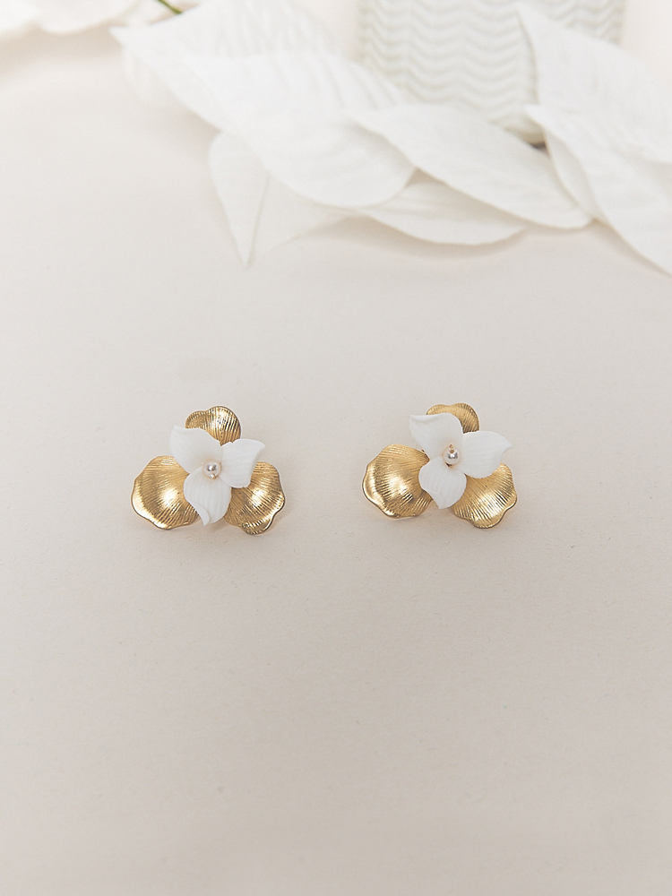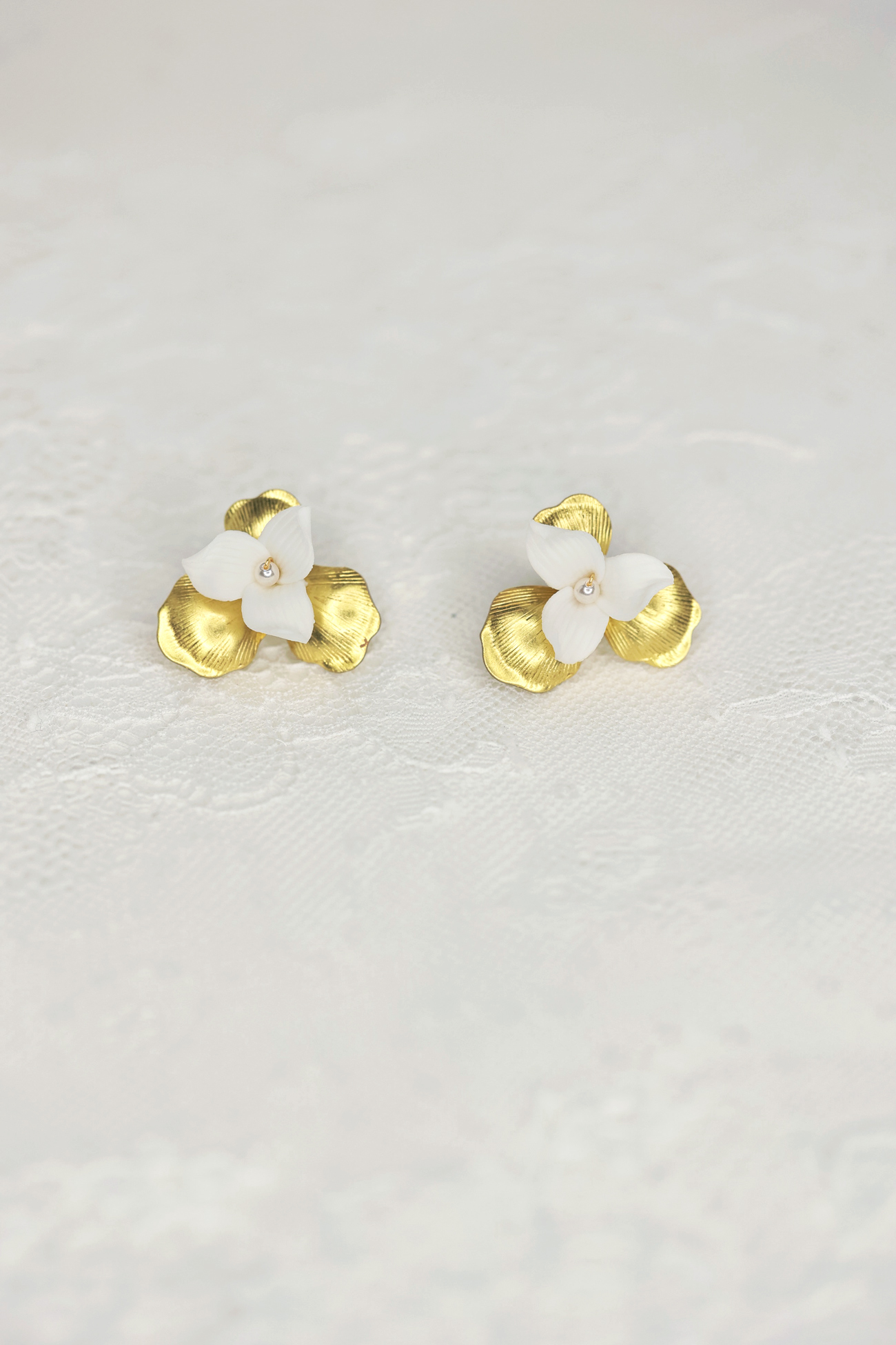 Elegant and Beautiful, a spin on our bestselling Bold Gold Earrings I have added a porcelain flower to the centre. The bold gold bridal earrings are easy to match to flower hair pins or gold tiara. The amazing thing about these earrings is that you can wear to any event not just a wedding.
