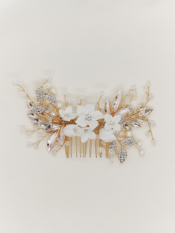 Beautiful hair comb with leaves and porcelain flowers. Available in Silver or Rose Gold on-line or in-store at Leah S Designs in Hallam.