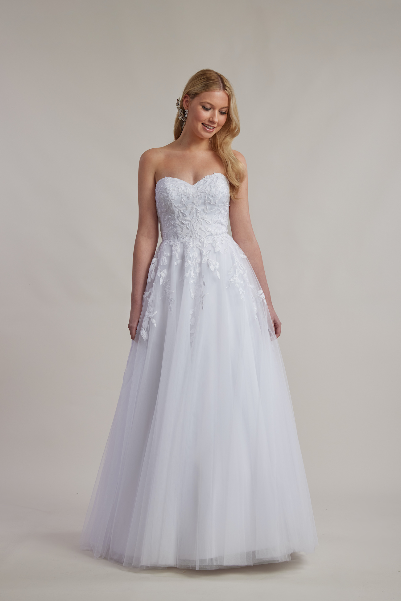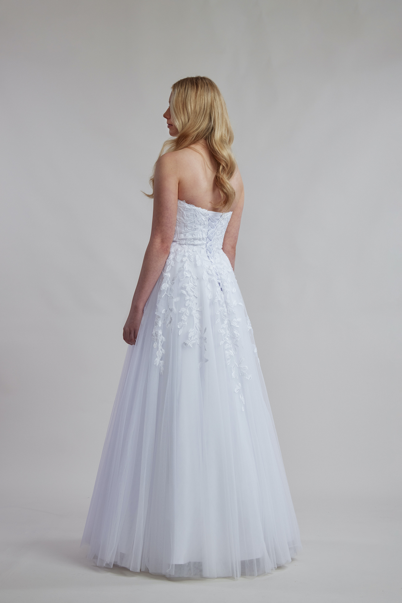 The soft tulle skirt adds an enchanting touch, while the lace bodice and feature back bring a unique twist to the traditional white strapless deb design. Available in white or ivory, and with sizes ranging from 4 to 22, there’s a perfect fit for every beautiful body.