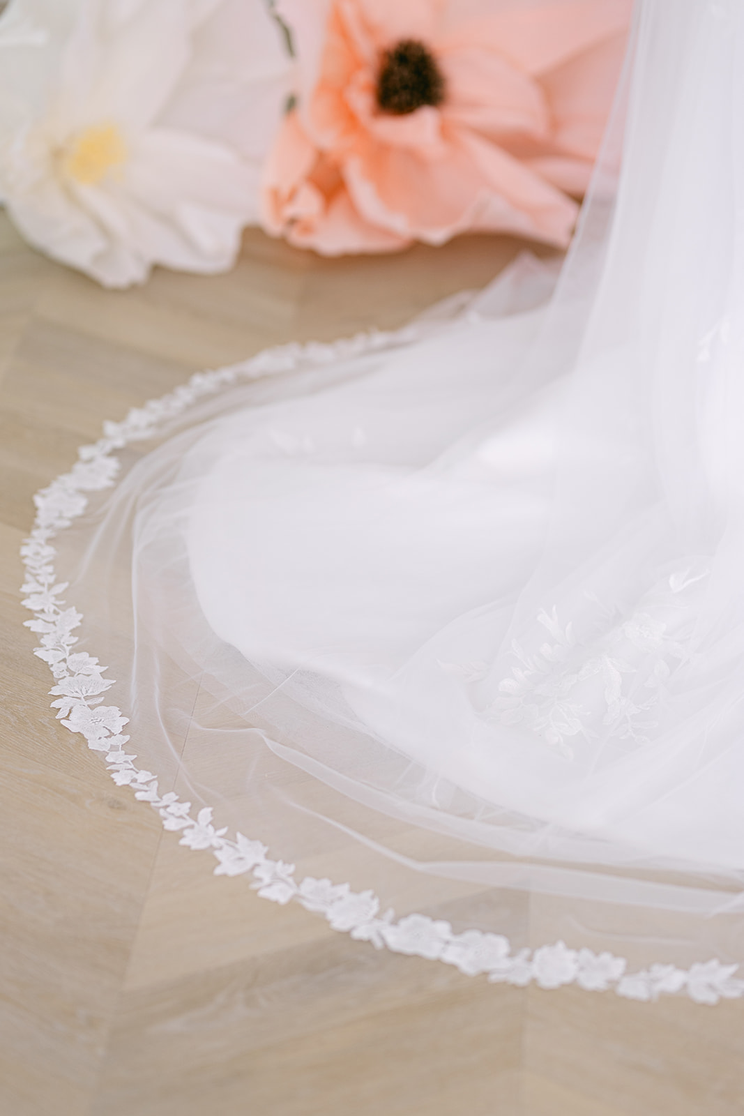 This single layer cathedral veil features a fine floral lace edging with tiny clear sequins scattered that sparkle in the sunlight.The Phoebe short cathedral length veil.