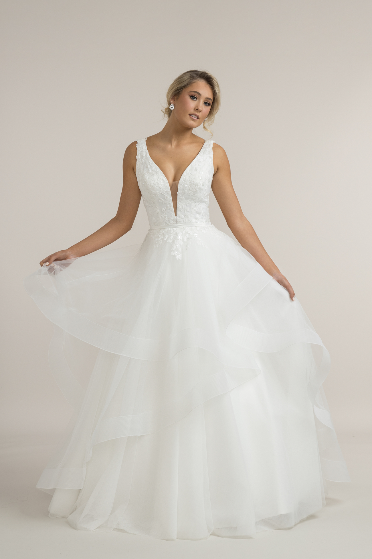 Replicating the beauty of Hollywood glamour. Sweet but a little bit sexy. Phoebe is an elegant, designer wedding dress. A pretty layered tulle skirt gives it a romantic, whimsical feel. The waterfall skirt is trimmed with edging that highlights the designer layering. This adds volume to the skit without gathering at the waist—teamed with a fully corseted fitted bodice and deep vee neckline that opens the neckline and draws attention to the face; Team these designer elements together for the ultimate silhouette.