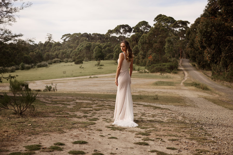 Introducing our stunning Quinn design beaded wedding gown that effortlessly blends classic elegance with modern sparkle. Available in both ivory and nude, this dress is crafted from a fabric covered in delicate, hand-sewn beads that shimmer beautifully in the light. Its sleek, fitted shape highlights your natural curves, flowing gracefully into a soft train.