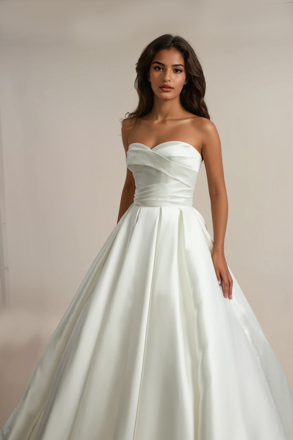 Scarlett – A Mikado Satin Ballgown It’s time for a fairytale moment, the Scarlett wedding dress by Leah S Designs is the ultimate princess-style wedding dress. Crafted from luxurious Mikado satin, this gown features a strapless, fully boned bodice that cinches the waist beautifully, offering both structure and elegance. The ballgown skirt, with box pleats, creates a grand and dramatic silhouette.
