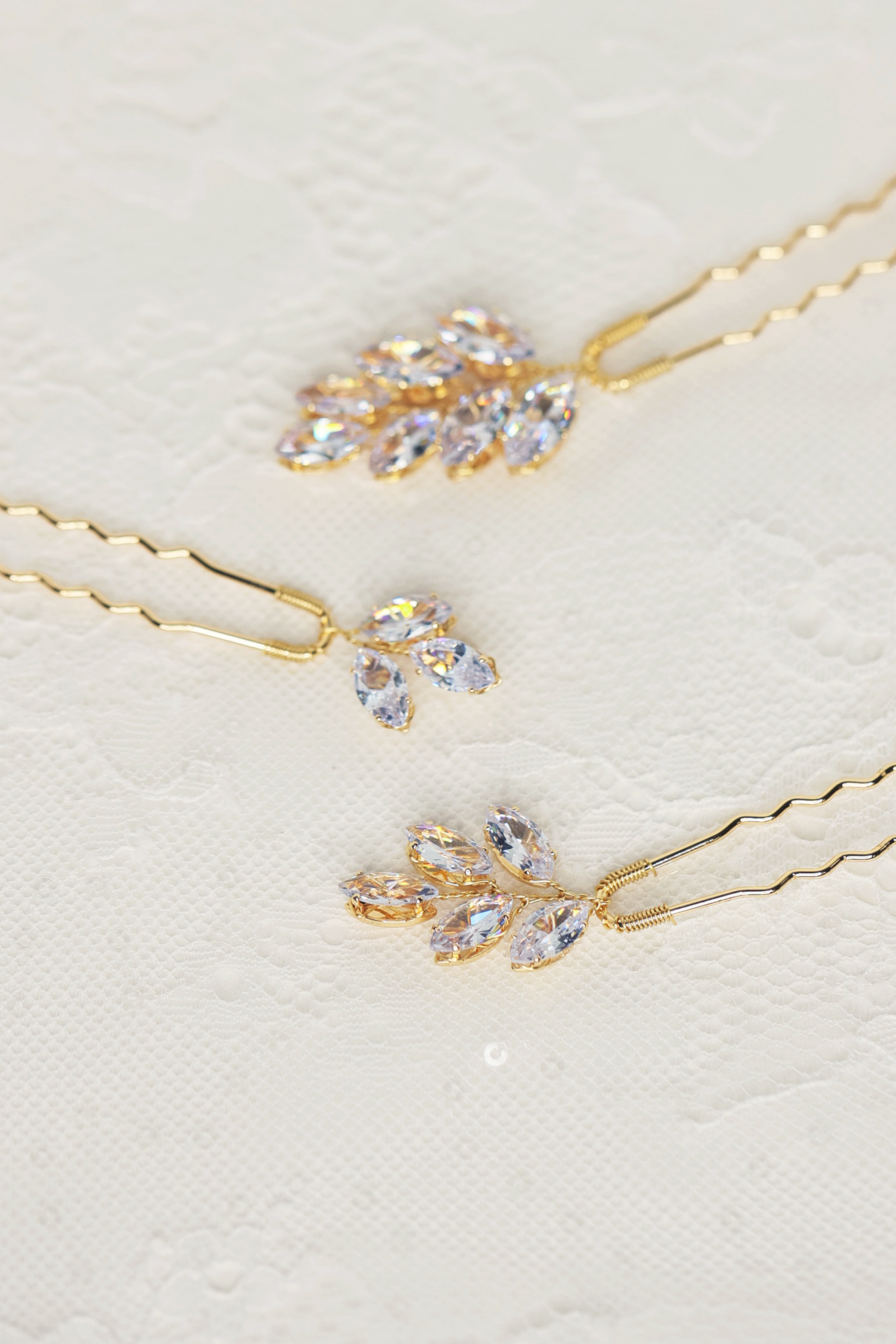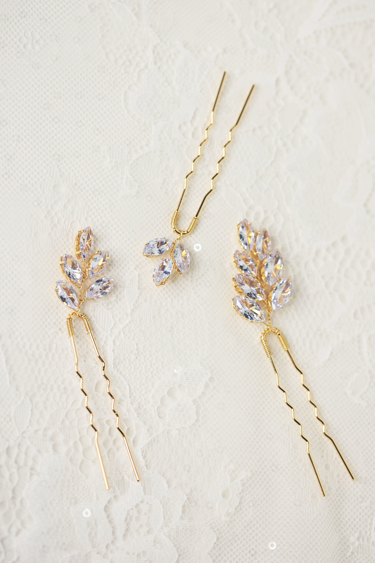 Set of three hair pins with diamontie details in gold.