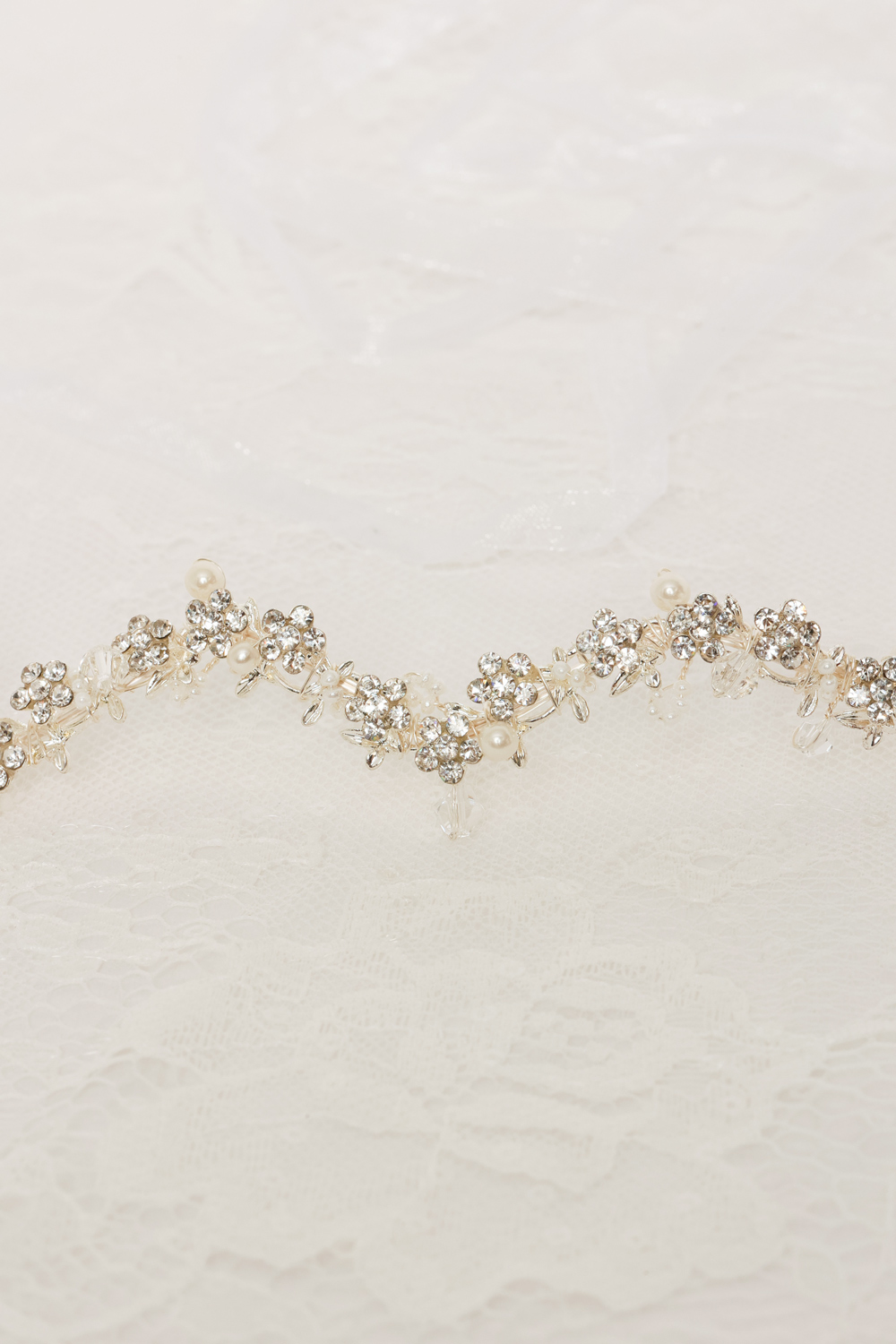 Hair vines for long hair. I always love to see the hair styles our brides are choosing for their wedding day (and debutante’s). This year its all about long mermaid waves, simple point tails and one of my all time favorite styles the long side plait. What do you think? Let you imagination run wild with this hair accessory creating your own style. This hair vine for long hair, is perfect worn intertwined through a side plait. Or possibly worn the more traditional way as an asymmetrical hair vine at the front of your hair style as we have done. With a detailed double flower design with interwoven crystals, pearls and leaves cascading down soft wire work.